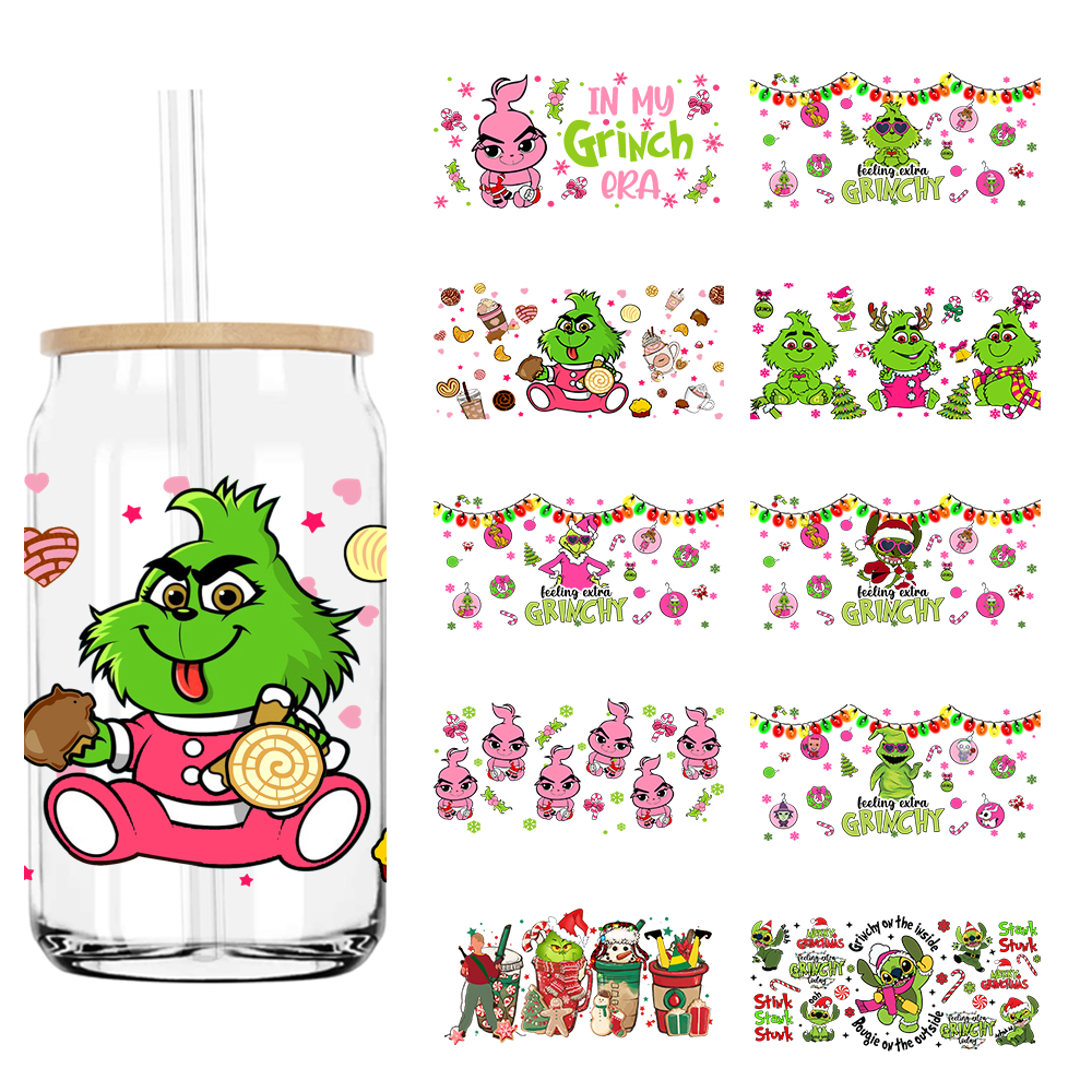 Christmas In My Grinch Era 16OZ UV DTF Cup Wrap Transfer Stickers Custom Labels DIY Durable Waterproof Logo For Libbey Glass Can