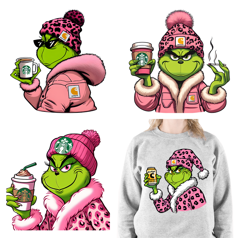 Cute Pink Leopard Coffee Boojee Grinch DTF Printing Iron On Grincy But Caffeinated Transfer Stickers Ready To Press For Hoodies