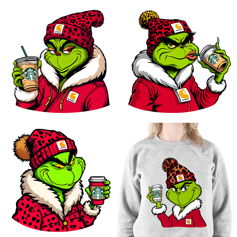 Red Leopard Drinking Coffee Boujee Grinch Coffee Lover Christmas Washable DTF Heat Transfer Stickers Ready To Press For T-Shirts