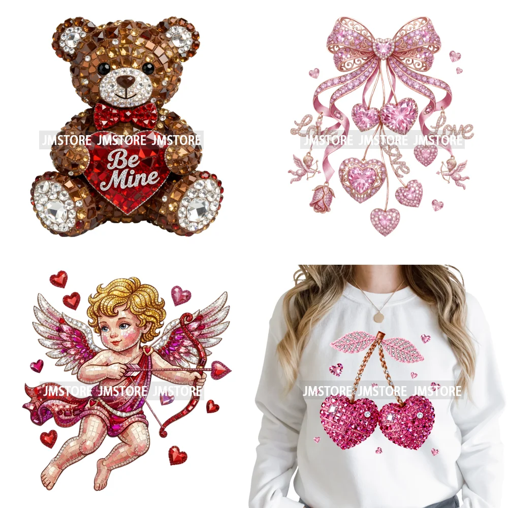 Funny Cherry Bow Faux Glitter Rhinestone Girly Valentine Heart Iron on DTF Heat Transfers Stickers Ready to Press for Clothing