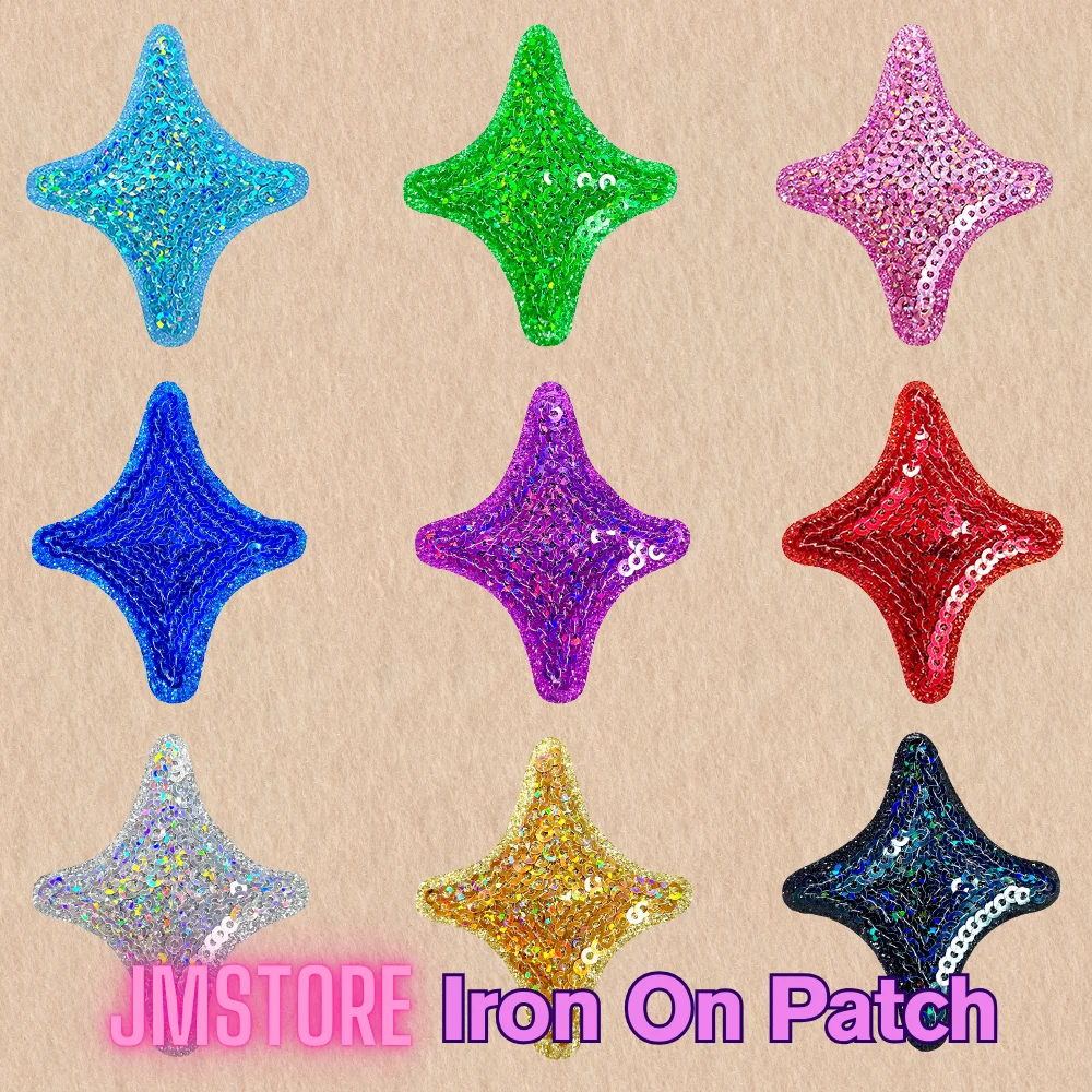 Colorful Rhombus Shaped Four Pointed Stars Sequin Stickers Iron on 3D Small Emblem Embroidered Patches for T-shirts Hats Bags