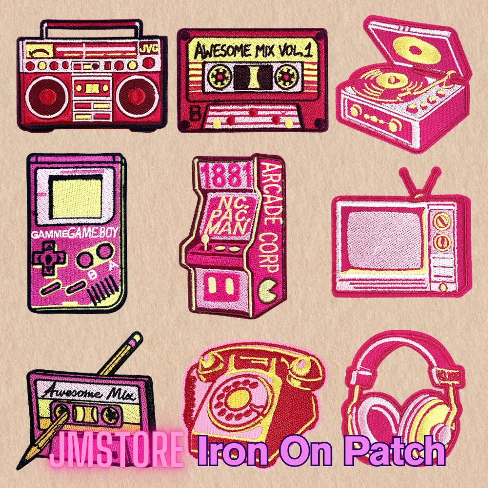 Retro Record Player Game Console Iron on Small Emblem Thermoadhesive Embroidery Patches Stickers Logo for Hoodies Hats Bags