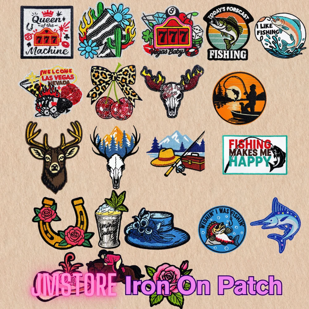 Round Fishing Horserace Outdoor Activities Flower Deer Iron on Small Emblem Thermoadhesive Sequin Embroidery Patches for Hoodies