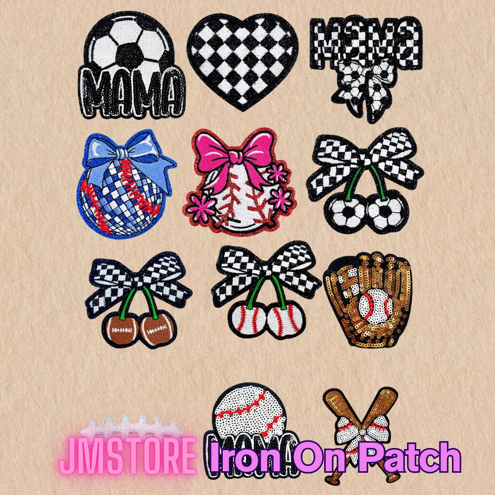 Sports Ball Game Mama Life Coquette Iron on Small Badge Sequin Thermoadhesive Embroidery Patches Logo for Sweatshirt Bags Hats