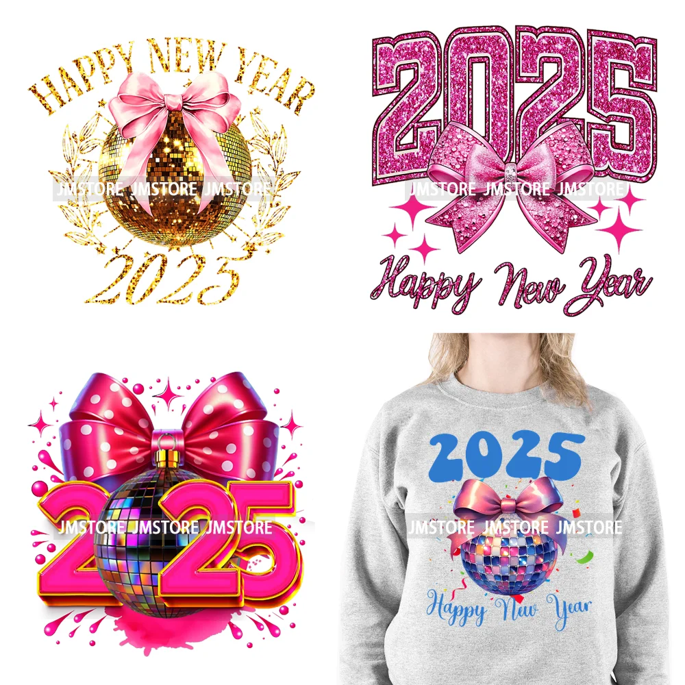 Colorful Faux Glitter Happy New Year Disco Ball Social Club Coquette Bow Iron On DTF Transfer Sticker Ready To Press For Clothes
