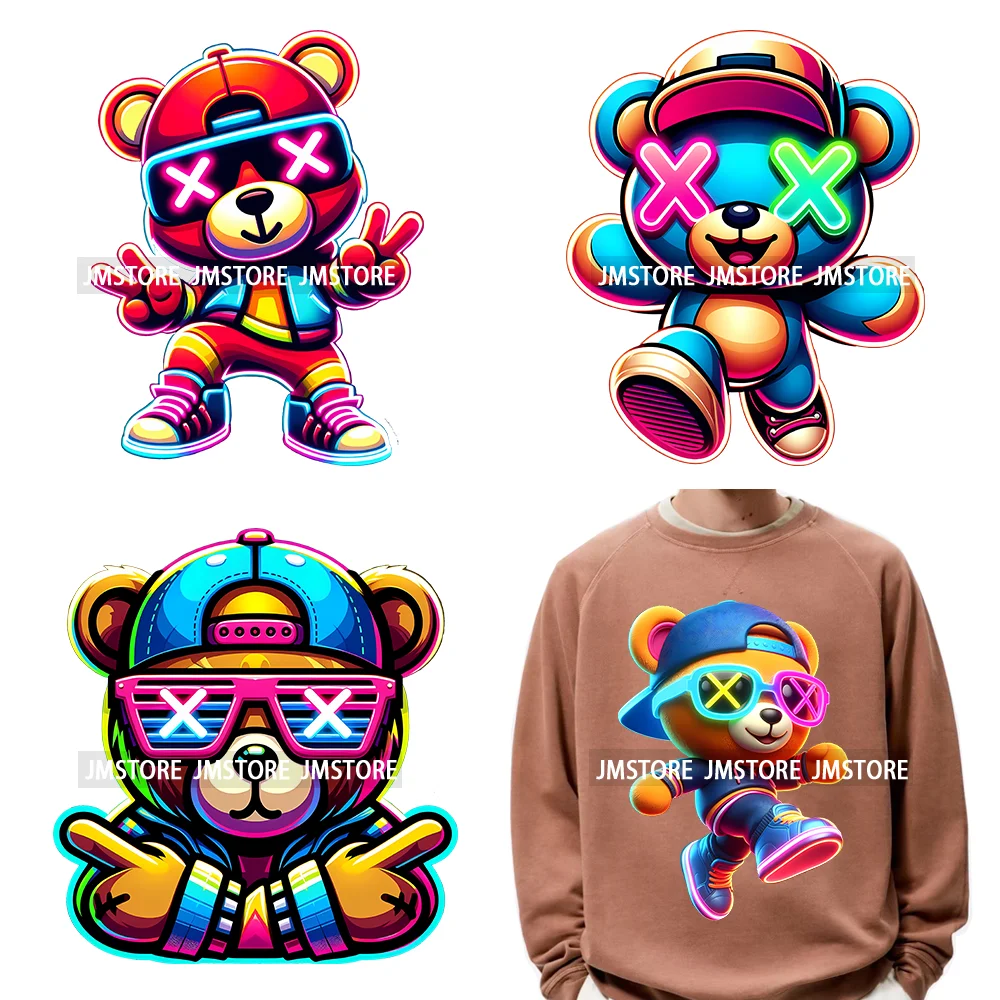 Cool Neon Colorful Hip Hop Streetwear Urban Teddy Bear Iron On DTF Transfers Stickers Ready To Press For Clothing Bags