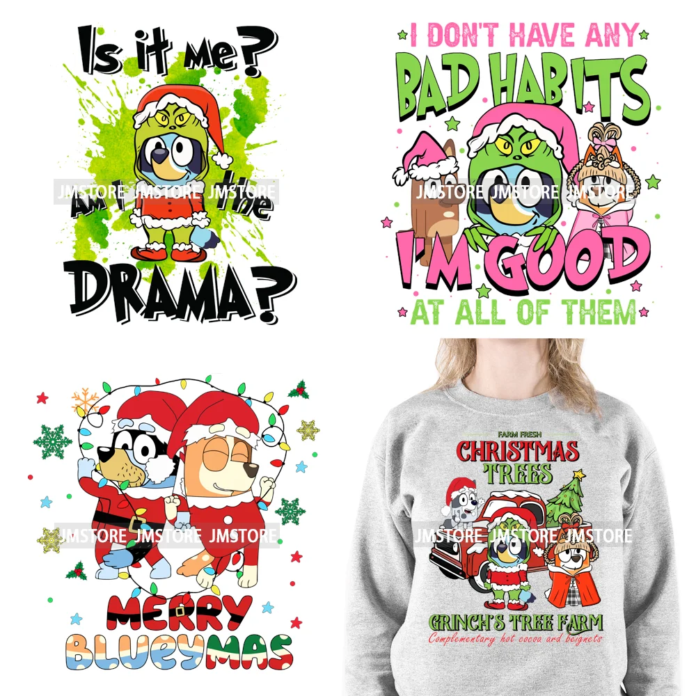 Cute Cartoon Blue Dog Family Character Merry Christmas Vibes Decals Iron On DTF Transfers Stickers Ready To Press For Sweatshirt