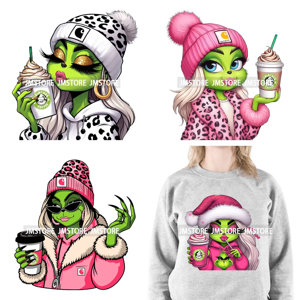 Green Bougie Lady Coffee Leopard Christmas Holiday Season Iron On DTF Transfers Stickers Ready To Press For T-shirts Bags